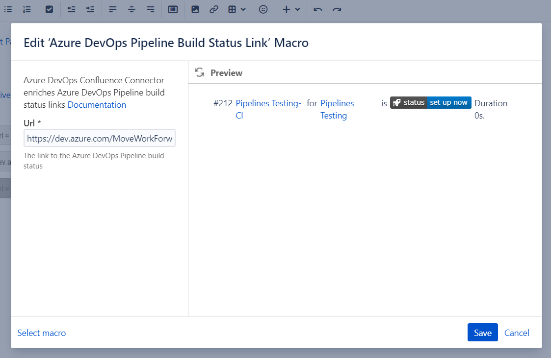 This macro allows you to embed a link to the build status of an Azure DevOps pipeline directly within a Confluence page. This allows users to quickly find out and view the detailed build status, including information such as the build number, duration and any associated artefacts or test results.