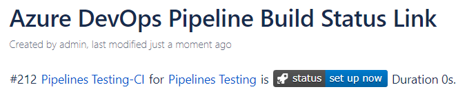This macro allows you to embed a link to the build status of an Azure DevOps pipeline directly within a Confluence page. This allows users to quickly find out and view the detailed build status, including information such as the build number, duration and any associated artefacts or test results.