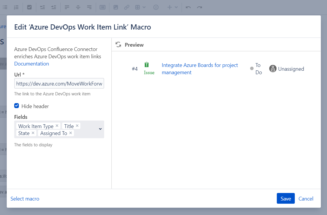 Enter the link to the Azure DevOps work item in the macro modal window.