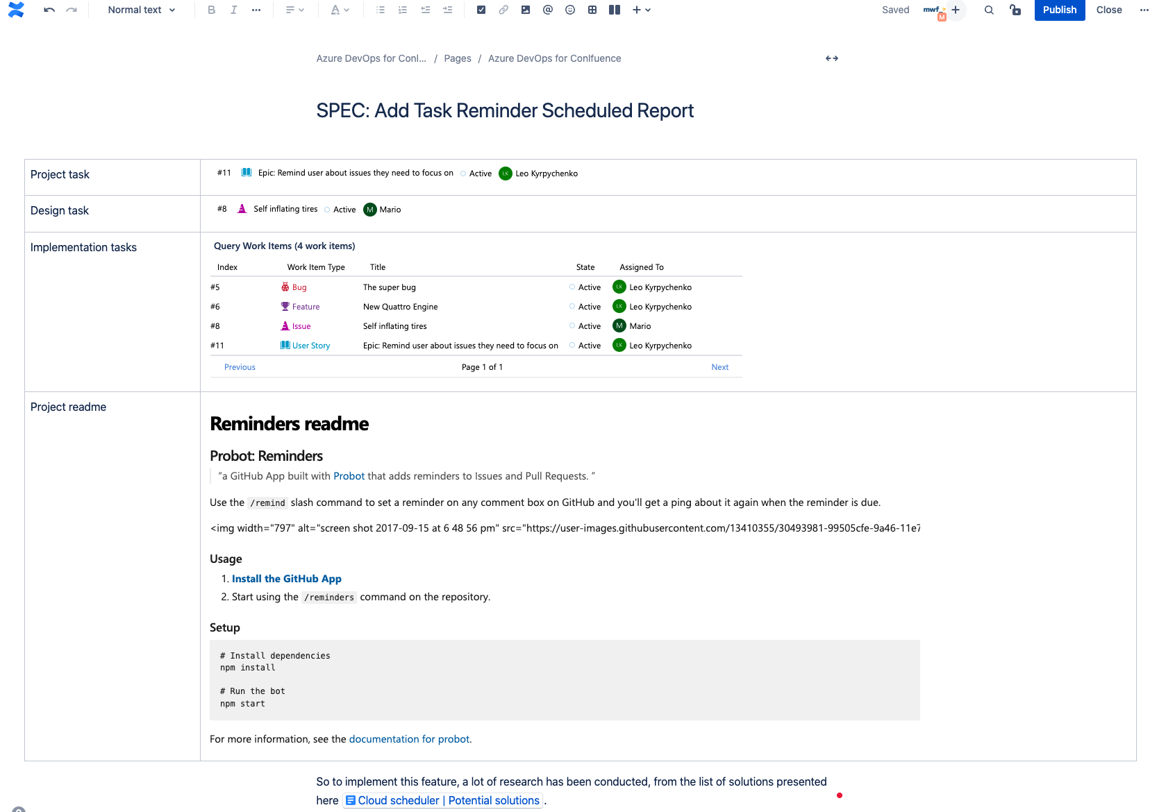 The technical specifications in Confluence link to the Azure DevOps work items, saved search queries and wiki pages to provide more context and transparency on tracked work tasks.