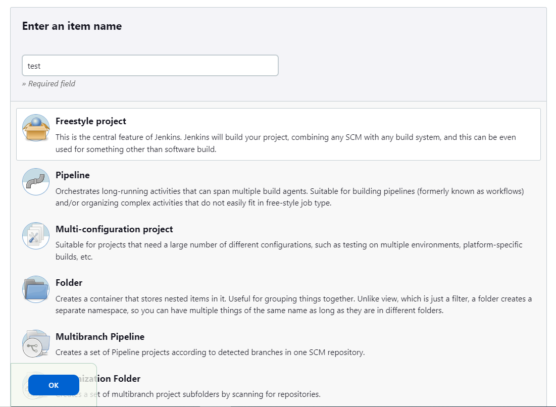 Select the Freestyle Project (or any other pipeline type) and click on OK.
