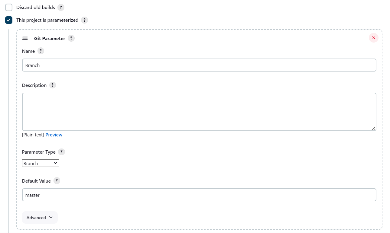 Name,Parameter typeandDefault valueof the Git parameter (as it is shown in the screenshot below).
