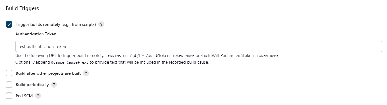 On the Build Triggers section select the option Trigger builds remotely (e.g., from scripts) and create an