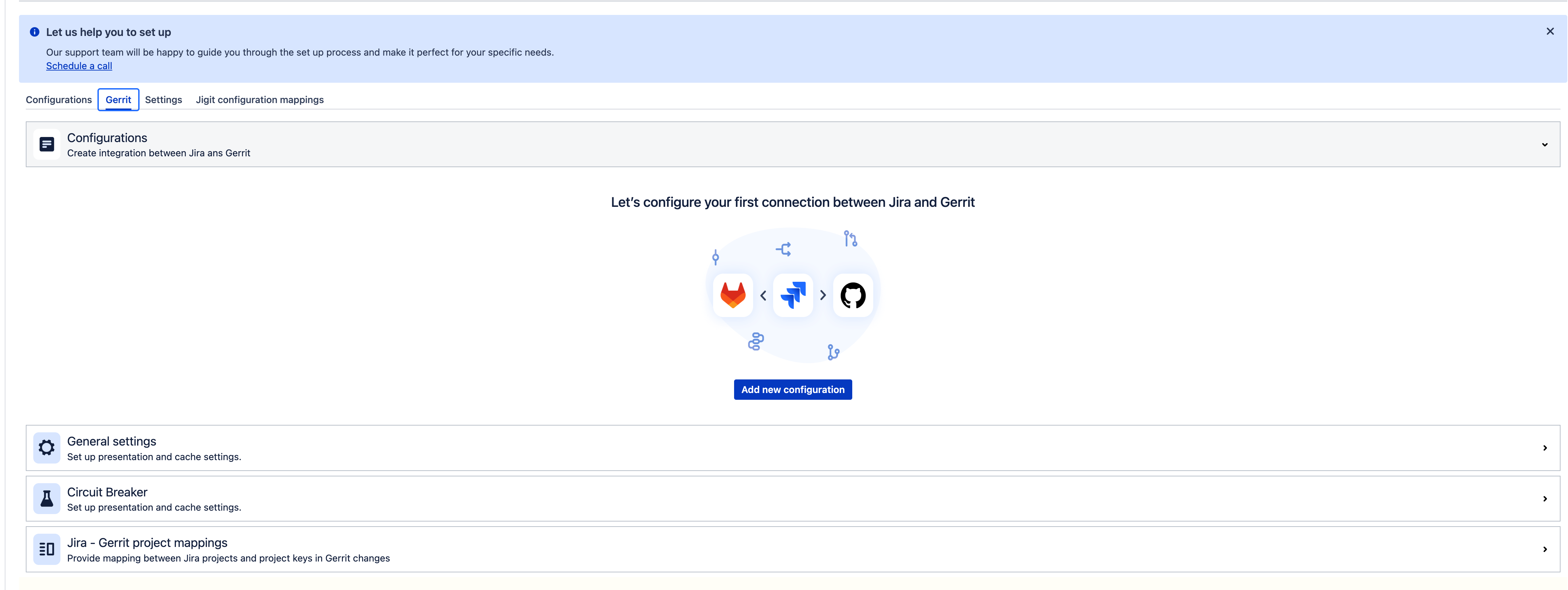 Gerrit code review integration | Link Gerrit changesets and reviews with your Jira issues. | To configure, navigate to the Gerrit tab on the global configuration page (available only for Jira administrators) and enable the integration. Learn more |