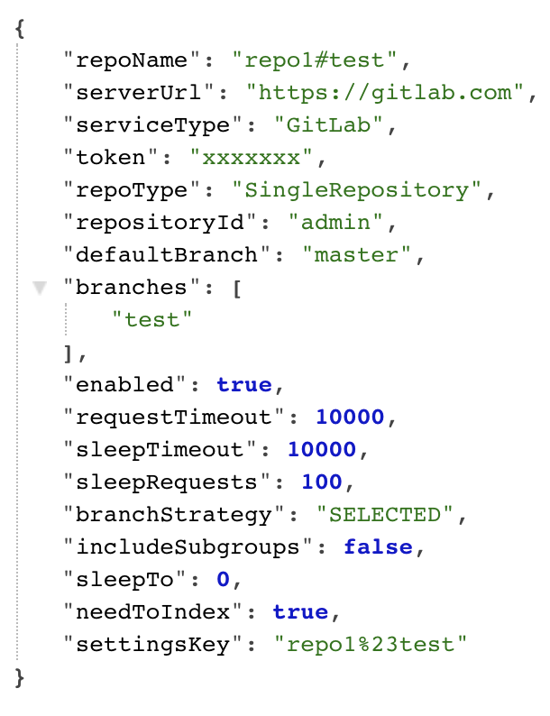 Form parameters(encoded):url=https%3A%2F%2Fgitlab.com&service_type=GitLab&token=TOKEN&change_token=on&repository_id=&repo_type=SingleRepository&def_branch=master&include_subgroups=on&branches_strategy=mask&request_timeout=10&sleep_timeout=10&sleep_requests=100&repo_name=test