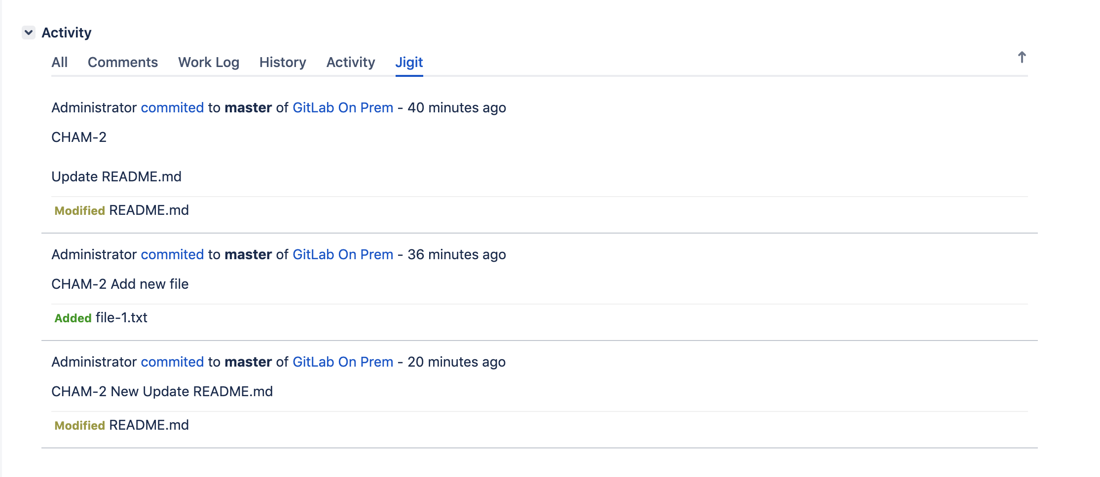 Jigit provides uni-directional integration between Jira and GitHub/GitLab using REST API of Source Code platform (GitLab/GitHub → Jira), which means GitLab/GitHub is not aware of Jira.