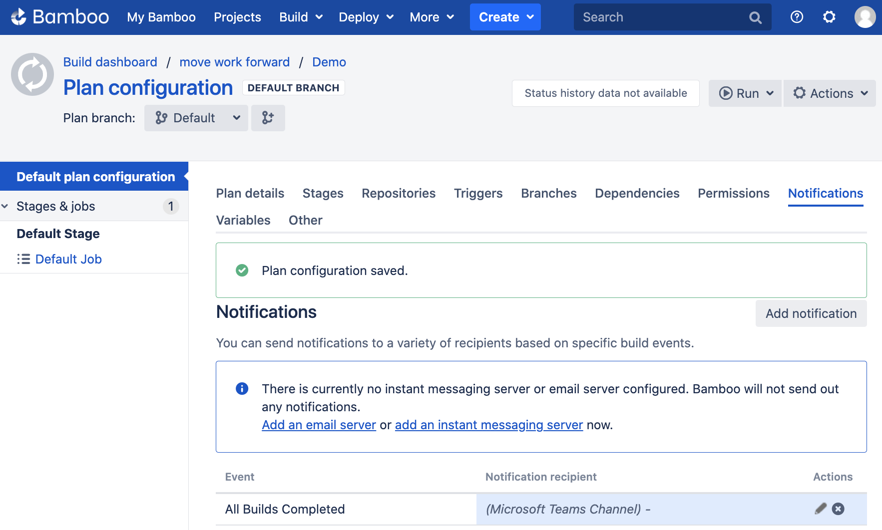 In addition to notifications, Bamboo also allows teams to create and manage build specs directly and integrate build plan Microsoft Teams notifications.