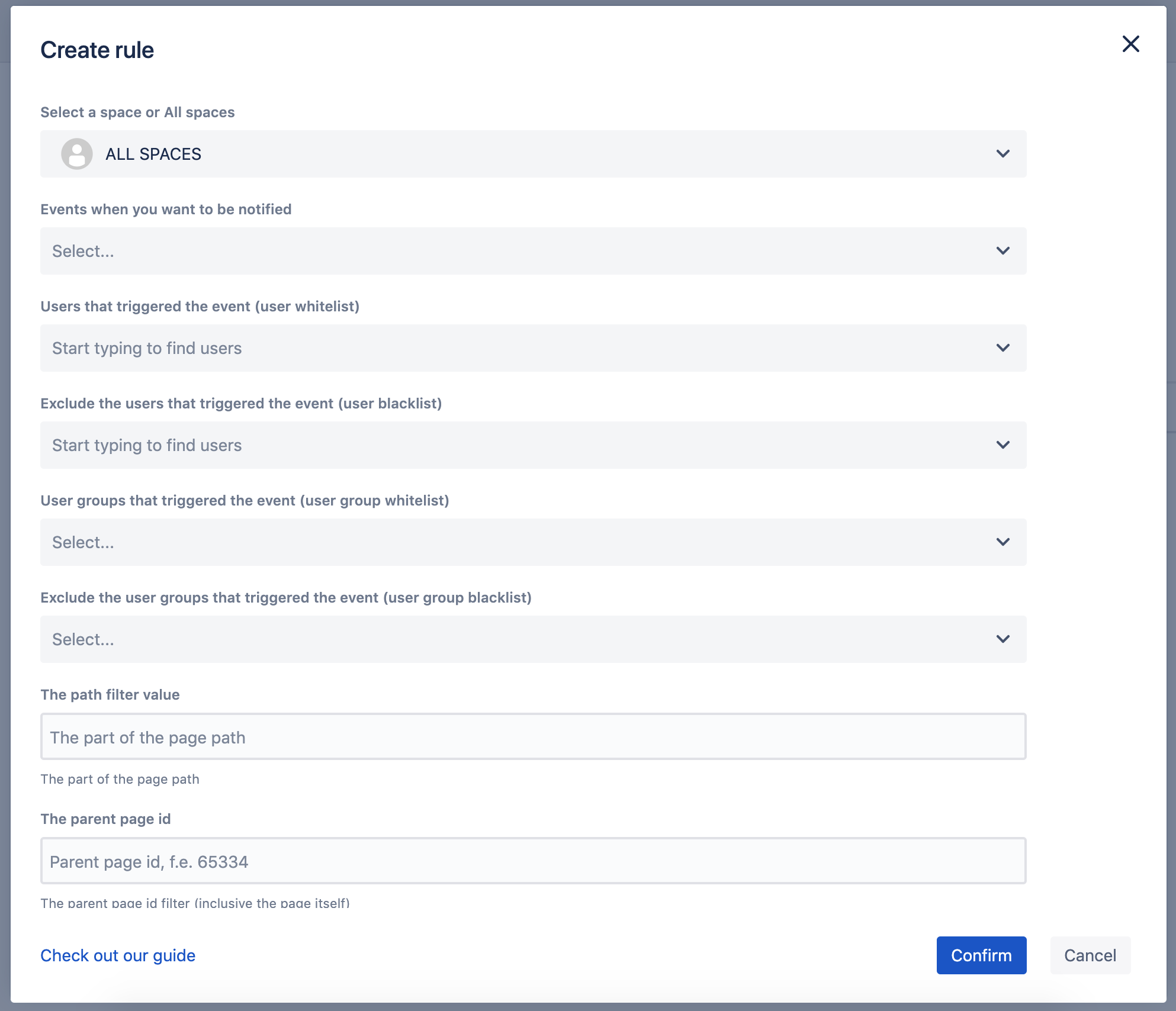 Receive notifications when a new Confluence Question or Answer is created (if the Confluence Questions app is used).
