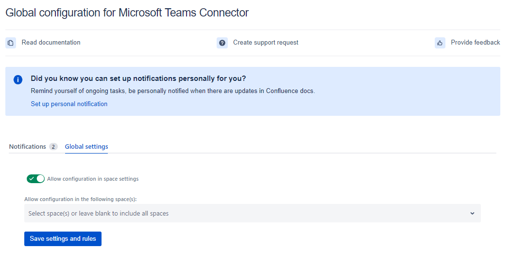On the Global Configuration page, Confluence admin can restrict spaces that can use Microsoft Teams Confluence Connector.
