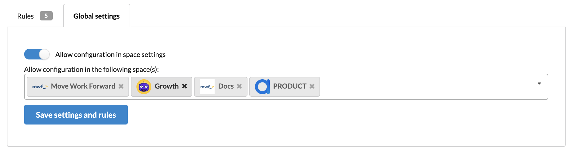 When the rule is saved, it can be viewed in the list of the Global, Space or Content specific rules. Space-specific rules are configured in the Space Settings section.