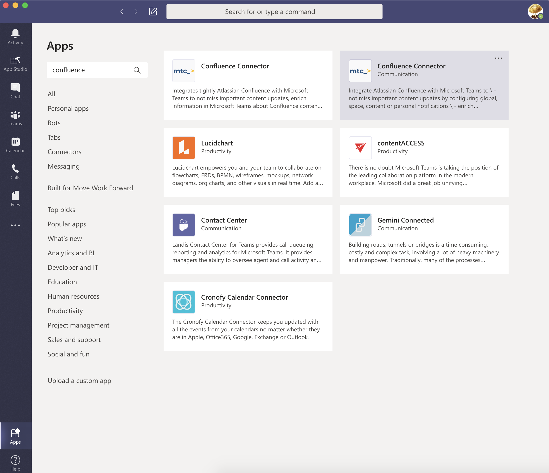 Navigate to the App store inside a Microsoft Teams client and search for “Confluence“ or “Confluence Connector“.