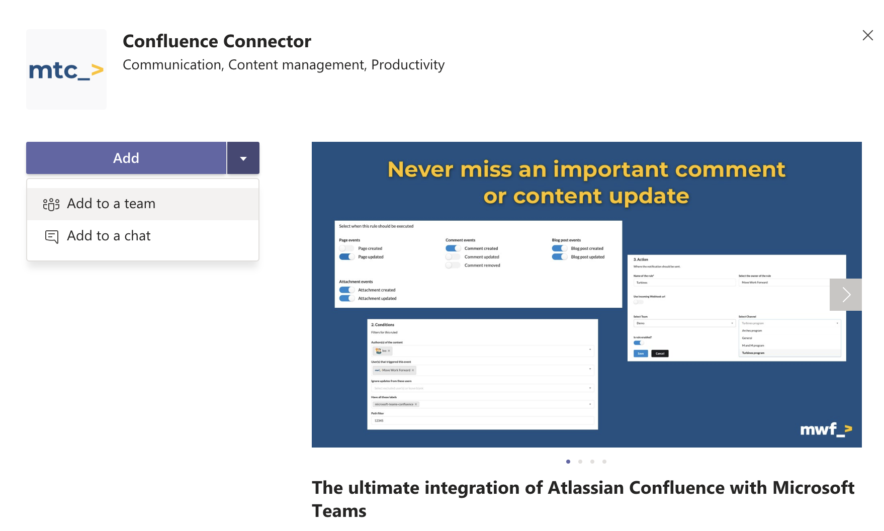 Atlassian Marketplace link: Advanced Microsoft Teams Confluence Connector.