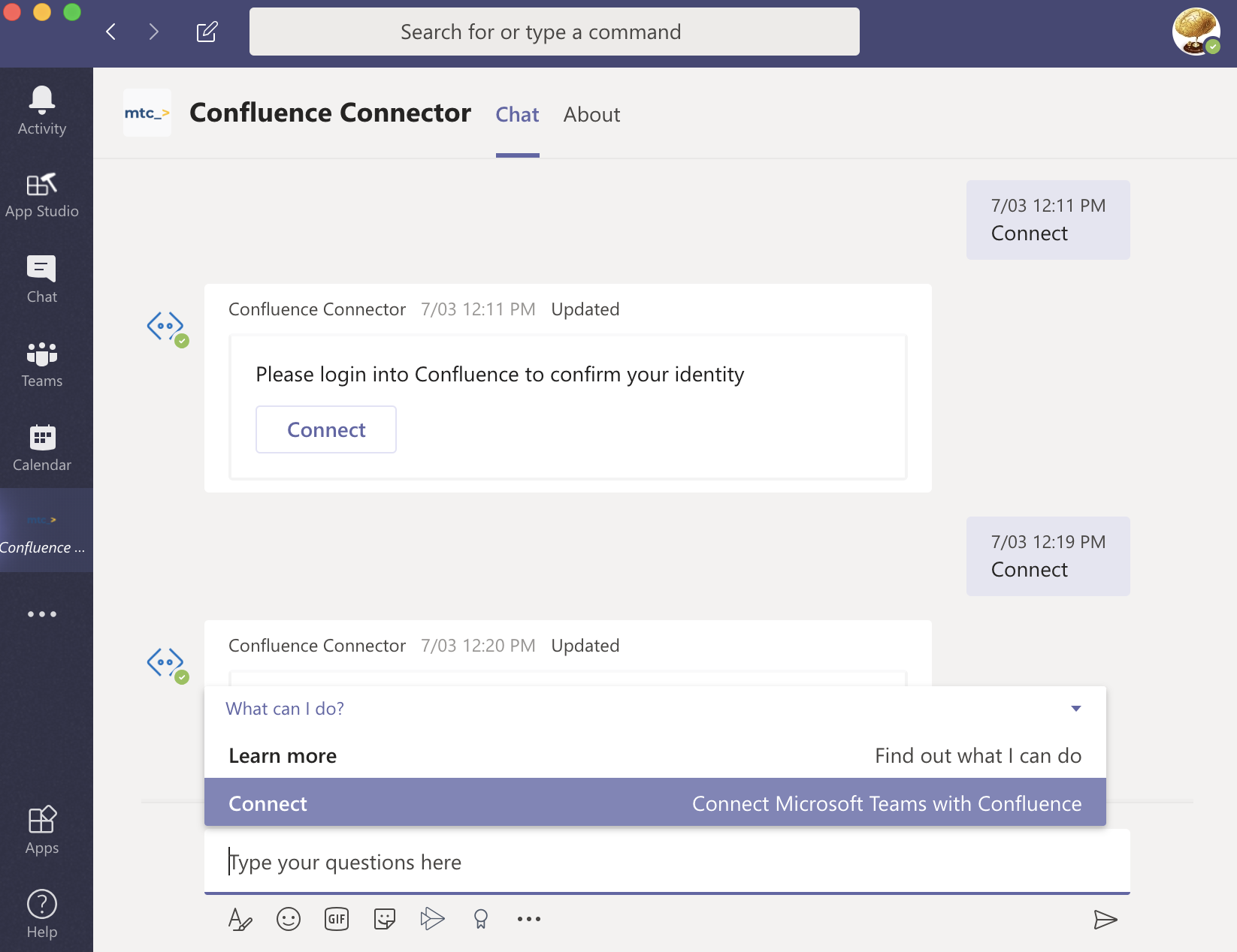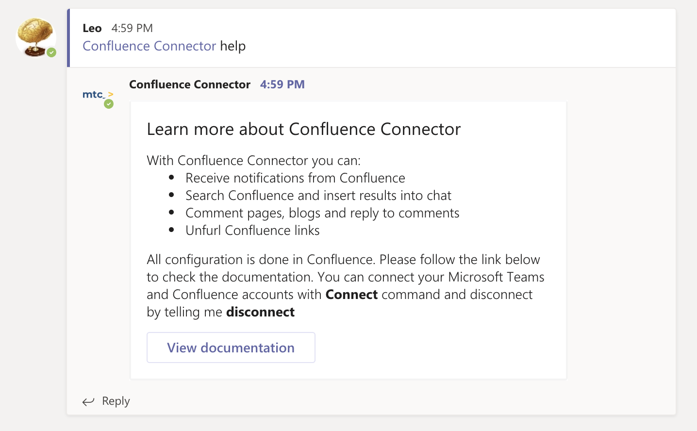 Microsoft Teams Confluence Connector Bot functionality