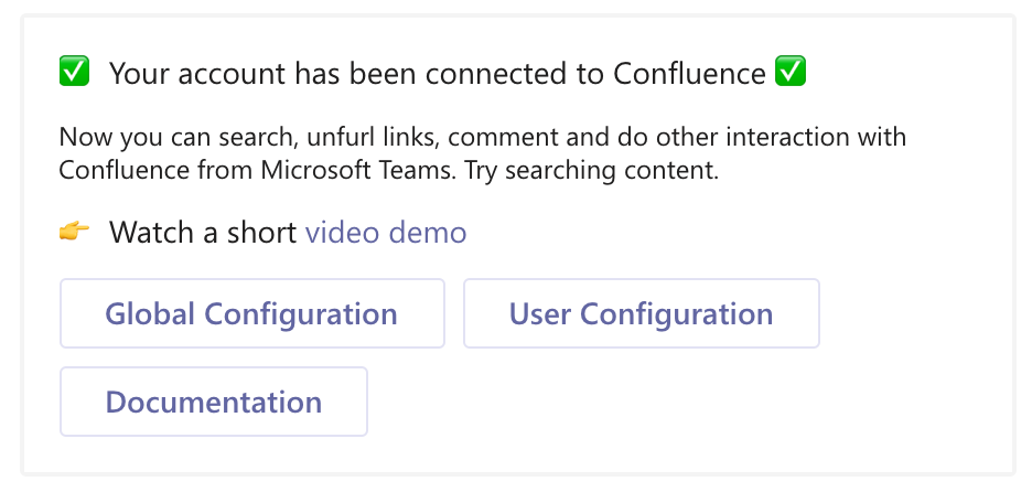 Afterwards, the special unique user link is generated to connect Microsoft Teams and Confluence accounts. The card from above will be swapped by the card displayed below.