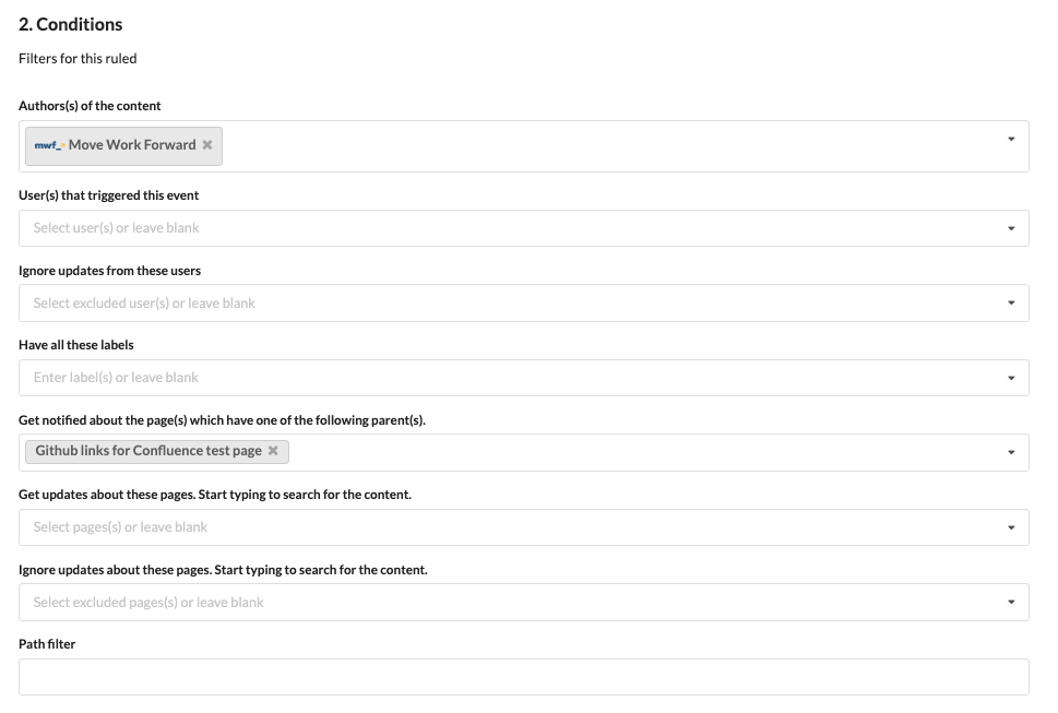 Have multiple rules and filters to fine-grain your notifications. Includes space filter, label filter, included and excluded users and authors, path filters, page and parent page, and event filters.