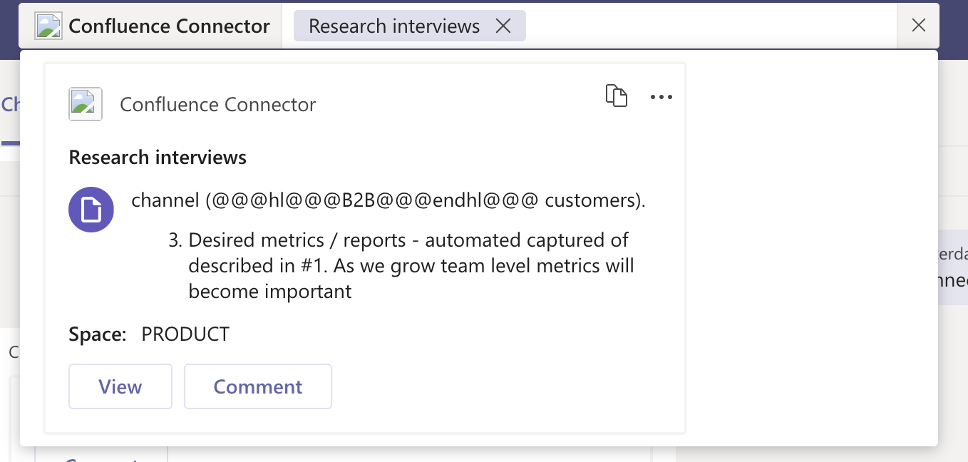 Comment Confluence content directly from Microsoft Teams. You must link Microsoft Teams and Confluence user accounts. `connect` command.