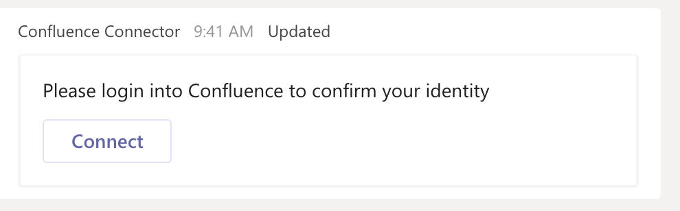 To interact with the Bot (search, unfurl, comment, etc.), you need to connect your Microsoft Teams and Confluence Cloud accounts. Accounts are connected between Microsoft Teams and Confluence tenants.