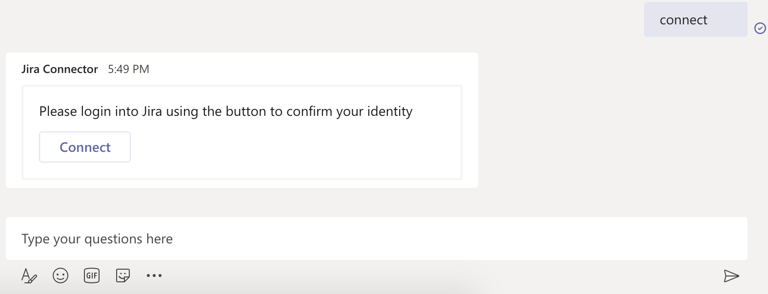 To map your Microsoft Teams and Atlassian Jira accounts you need to type connect in one on one conversation with the Microsoft Teams Jira Connector bot.