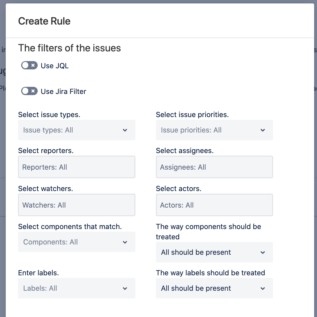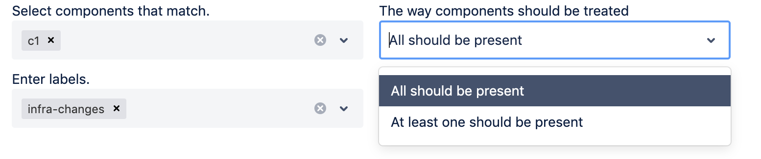 Your team owns a set of components and you want to get notified when somebody creates an issue related to your components. You will set up the components filter with At least one should be the present matching strategy.