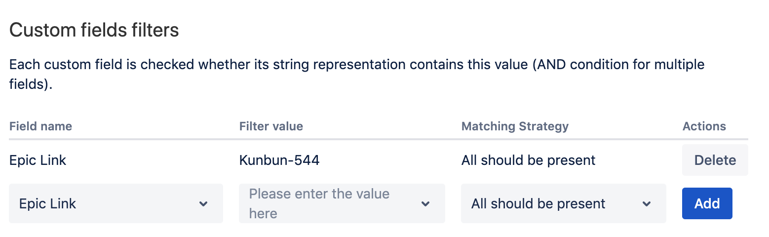Some filters have a matching strategy that will provide more flexibility on how they should be matched. Currently, matching strategies are supported for labels, components and custom fields.