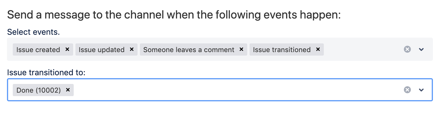 You own a project and want to know when an issue is transitioned to Done or commented. You can set up event filters with an issue status transition filter to narrow down the number of notifications you get. And don’t forget to select the Jira project you care about as another filter also.