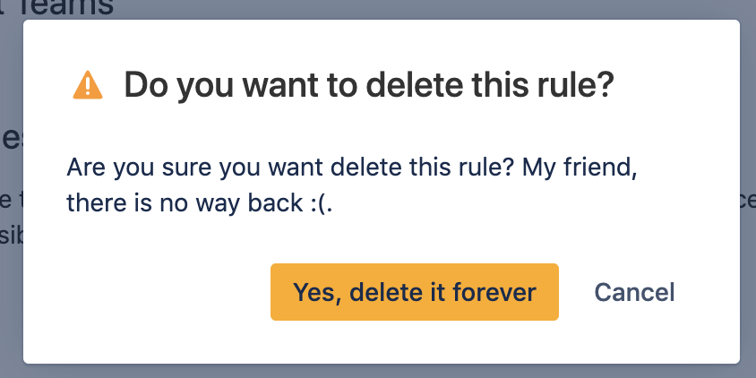 When a person deletes a rule they have a confirmation dialogue which is the last stop before the deletion process can be aborted.