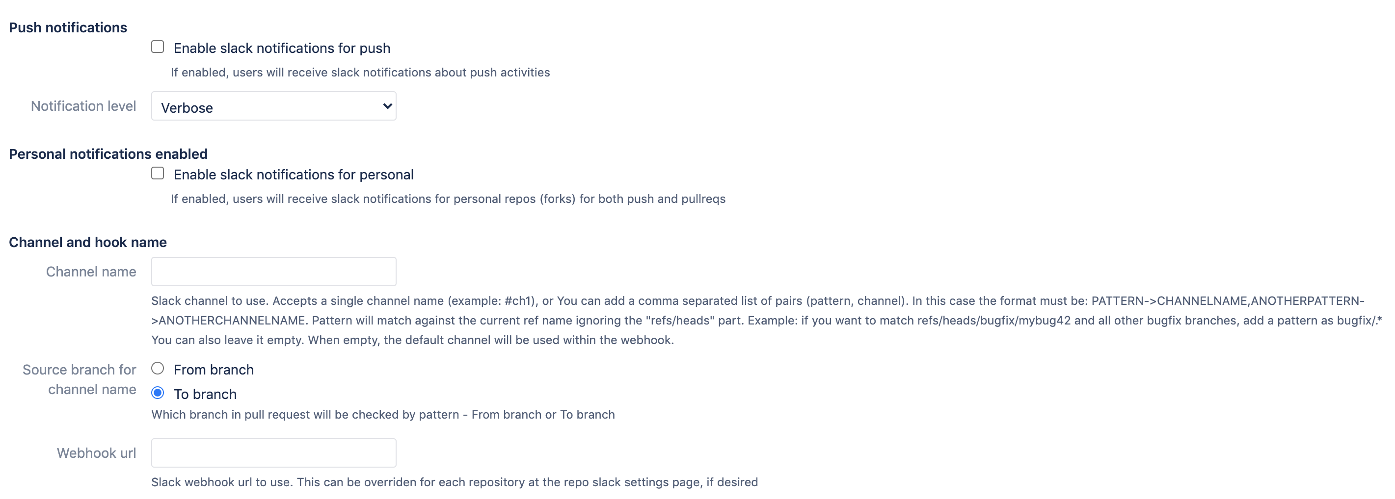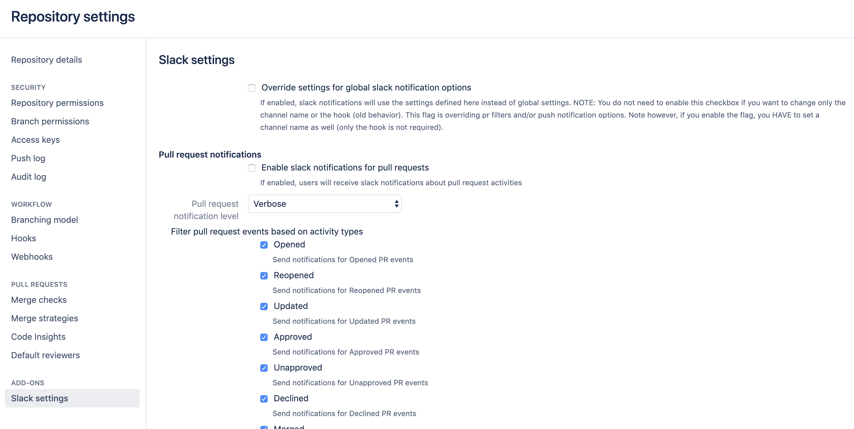 Override settings for global Slack notification options - If enabled, Slack notifications will use the settings defined on the repository level instead of global settings. This flag overrides pull request filters or push notification options. Note, if you enable the flag, you MUST set a channel name as well (only the hook is not required).