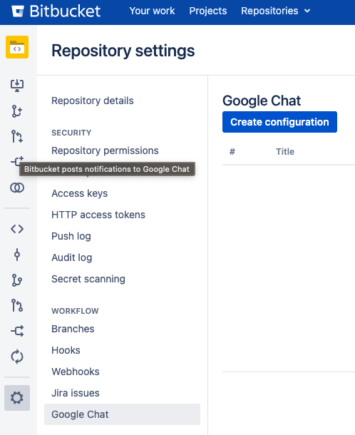 After you installed the Google Chat Bitbucket integration app, navigate to Repository Settings → Workflow → Google Chat.