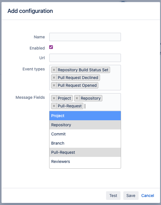 In the Message fields field, you can configure which Bitbucket information you want to see in Google Chat.